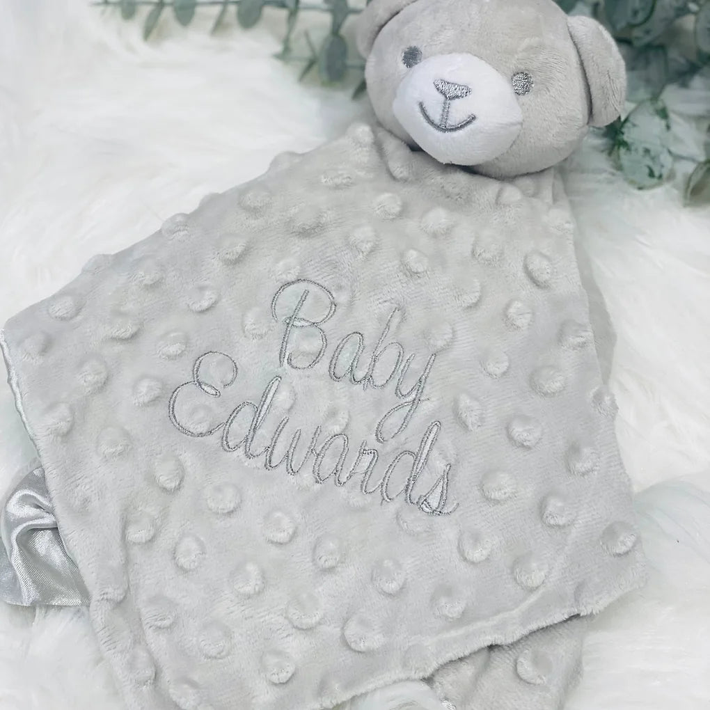 These super cute baby comforters are a lovely gift for baby showers or new baby gift.The comforters come embroidered with any name. These have soft dimple fabric on the top side with a soft silky texture on the underside.
